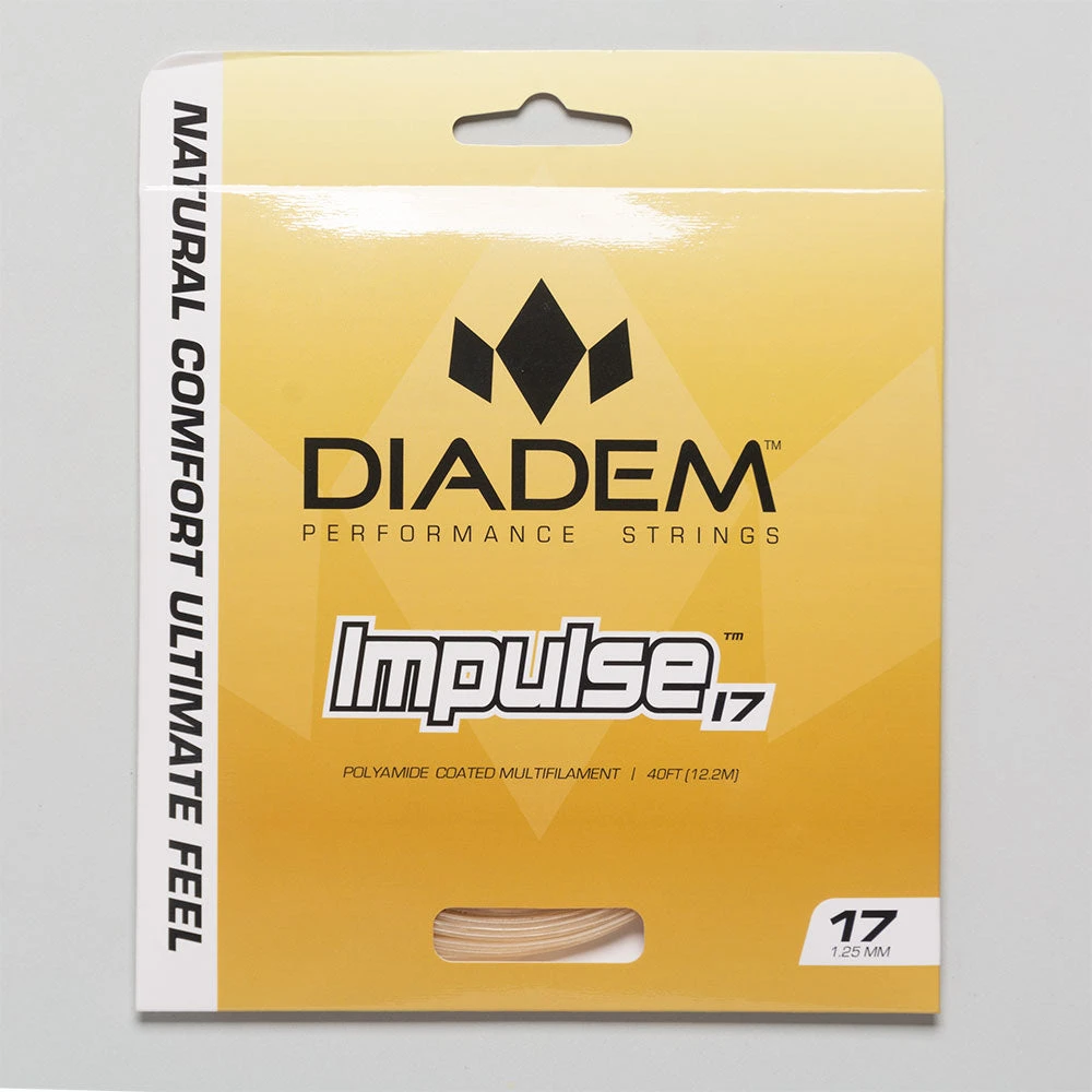 Get the perfect blend of touch, comfort and feel with the Diadem Impulse 17 1.25 tennis string! Designed with an extra layer of low-friction polyamide coating, this multifilament string enhances spin and snapback. Tennis players with elbow issues will appreciate the soft feel at impact. Players with slow to moderate swing speeds will enjoy the power of Impulse. If you want the natural feel of a multifilament, try the Diadem Impulse 17 1.25!